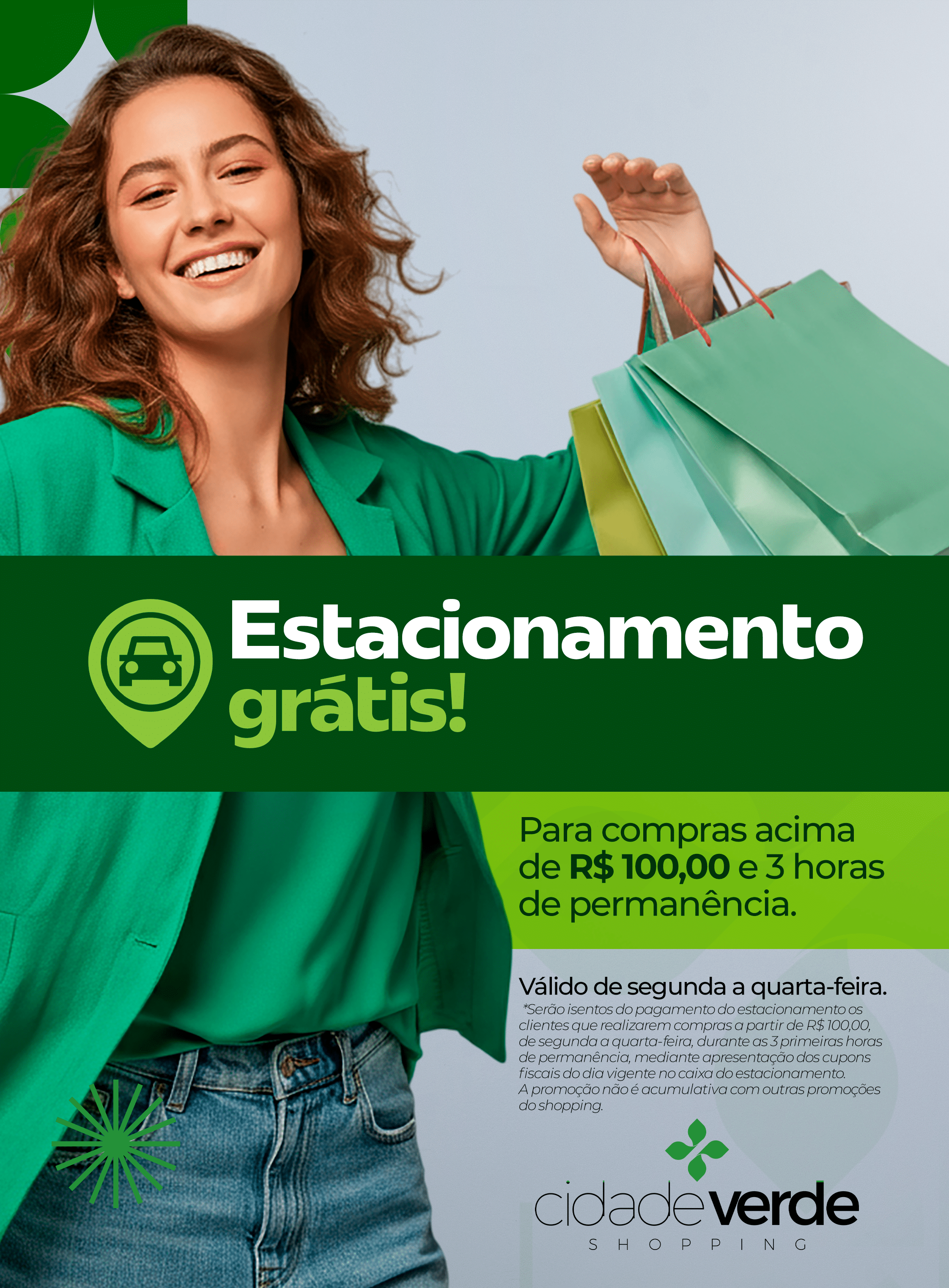 Importante: *Serão isentos do pagamento do estacionamento os clientes que realizarem compras a partir de R$100,00, de segunda a quarta-feira, durante as 4 primeiras horas de permanência, mediante apresentação dos cupons fiscais do dia vigente no caixa do estacionamento. A promoção não é acumulativa com outras promoções do shopping.