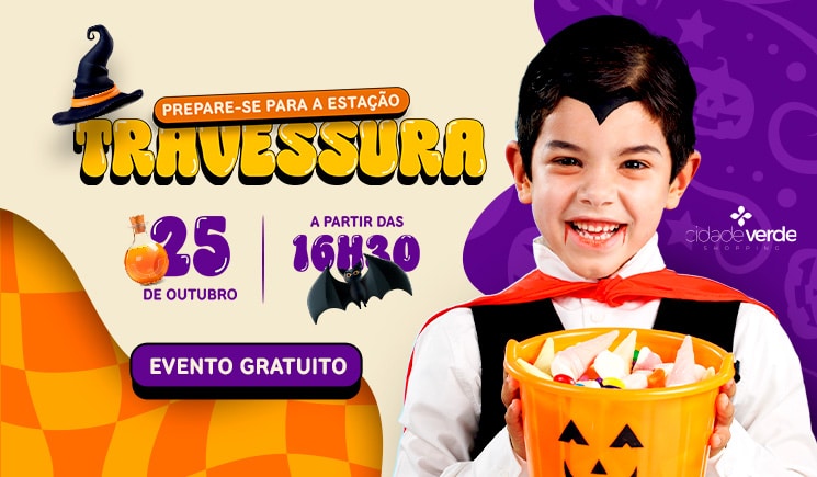 Desfile de fantasias, caça aos doces, recreação e muita brincadeira animam o Halloween do Shopping Cidade Verde neste domingo (27). O evento gratuito terá início às 16h30 e encerra a programação do Mês das Crianças do mall, que contou com Feira de Livros, oficinas, música e contação de histórias.